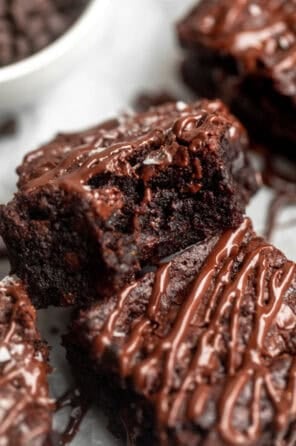 Bake for 38-42 minutes or until a toothpick comes out mostly clean. Let cool completely before slicing. This is SO important so the brownies don’t crumble! I drizzled mine with melted chocolate chips and added flaky salt. Enjoy and try my flourless brownies next!