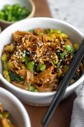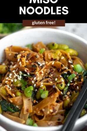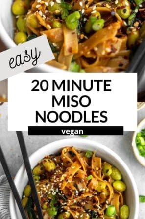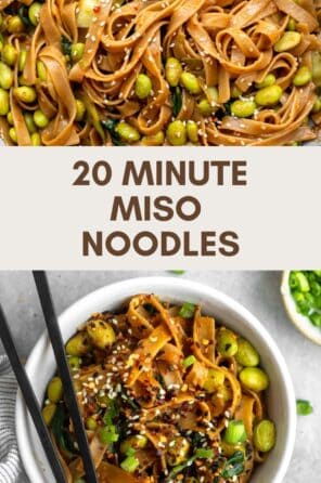 These miso noodles are a quick and easy vegetarian dinner recipe that are ready in under 30 minutes! They have a perfectly savory and salty flavor, edamame for protein and are totally customizable.