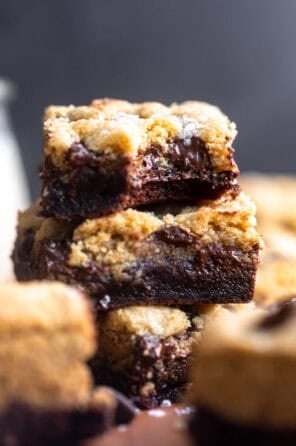 Divide the dough into about 4 large balls. Flatten each ball in your hand and place on top of the brownie layer, pressing into the corners of the pan. Take any leftover dough and press to fill in any gaps. Top with extra chocolate chips if desired. Bake for 25-30 minutes or until the edges are just golden brown and the center looks set. Let cool fully in the pan, then slice and enjoy! Try my gluten free brownie cookies next!