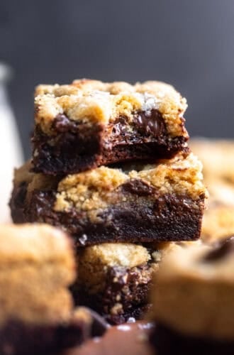 Sugar. For the cookie layer, you need a mix of white sugar and brown sugar, which add moisture but also give a crispy edge. For the brownies, white sugar works best, but you can sub for brown if you prefer. I don’t recommend any liquid sweeteners here.