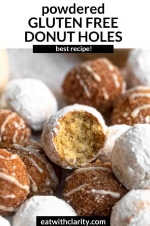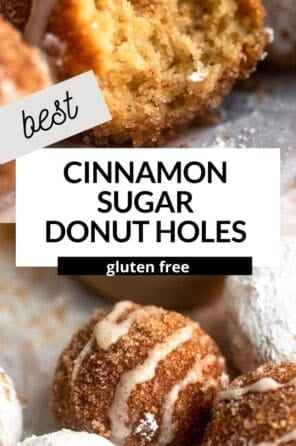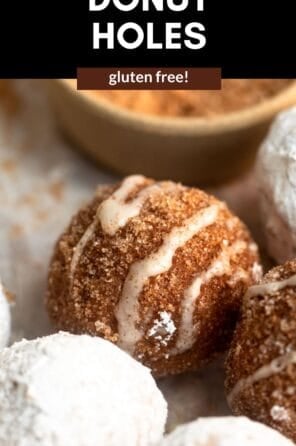We have several gluten free donut recipes on the blog (my apple cider donuts are perfect for Fall) but I was always a donut hole girl growing up, but we called them munchkins. You can coat them in powdered sugar, butter and cinnamon sugar or make a simple two ingredient glaze.