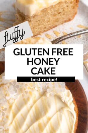 This gluten free honey cake is fluffy like a cloud and so delicious. It has a moist and tender honey vanilla base, a honey butter glaze and topped with an extra fluffy whipped mascarpone frosting. An unsuspecting but totally crowd pleasing recipe!