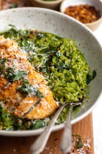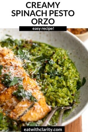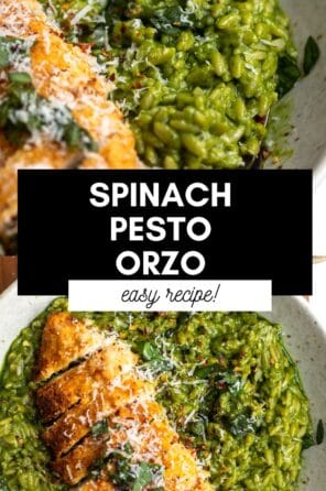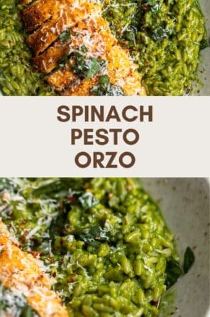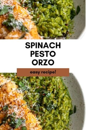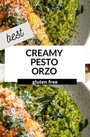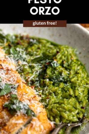 This pesto orzo is a creamy and flavorful gluten free dish that is ready to eat in about 30 minutes! It’s packed with veggies, high in protein and delicious topped with my air fryer parmesan chicken cutlets.