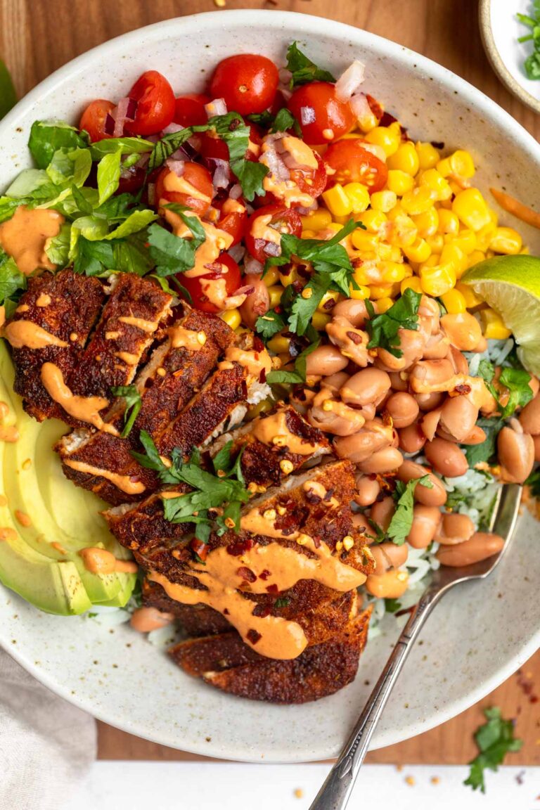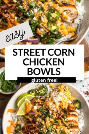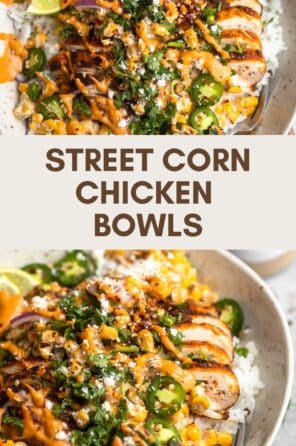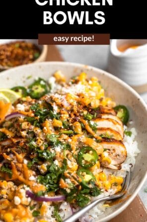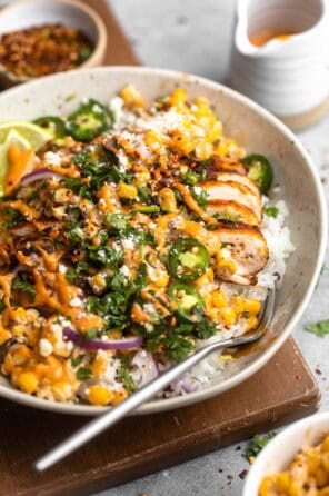 My street corn pasta salad is a favorite Summer recipe, but these street corn chicken rice bowls are really starting to rival that! They’re so easy to make, with a base of cilantro lime rice, then topped with a quick homemade street corn, roasted chicken thighs with lots of fresh spices and topped with my chipotle aioli. For a different flavor profile, my cilantro lime crema is also delicious!